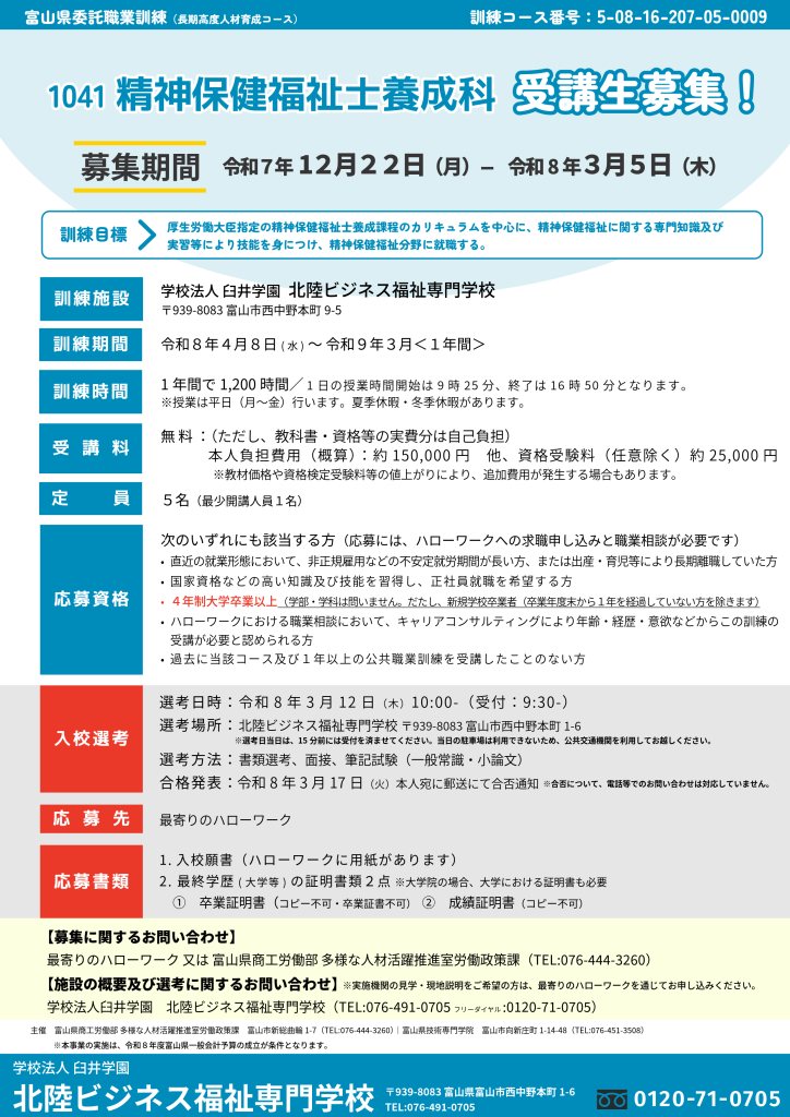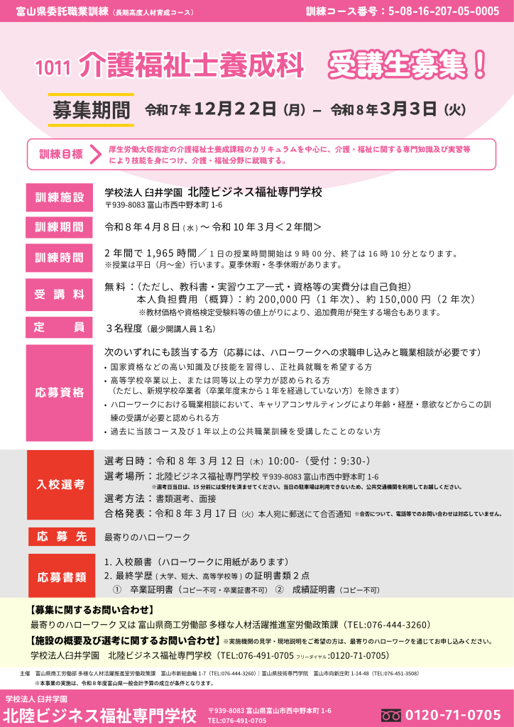 令和8年度委託職業訓練受講生の募集について(介護福祉士養成科・精神保健福祉士養成科) 投稿日 2025年12月5日2025年12月5日 by henshu-hbf ハローワークにて、富山県委託職業訓練(長期高度人材育成コース)の受講生を募集します。 【募集期間】介護福祉士養成科 :令和7年12月22日(月)~令和8年3月3日(火) 精神保健福祉士養成科:令和7年12月22日(月)~令和8年3月5日(木) ※詳細は以下のチラシをご確認ください。 各分野への再就職を応援します!国家資格取得を目指して、一緒にがんばりましょう!